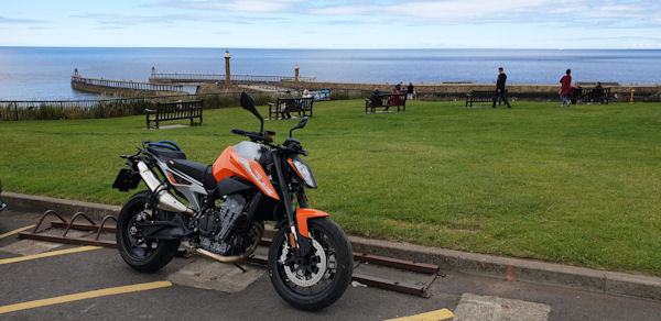 In Whitby I rode down into town and across the old swing bridge but couldn't turn right towards the pier, more alterations, so headed through town and the slightly longer less interesting route, up to the Captain Cook memorial. After a few pictures were snapped I wandered over to Clara's for a cup of tea and an ice-cream, it wasn't the warmest day but I couldn't resist. Sitting on some steps by the cliff was a great way to spend 20 minutes, watching the world go by. Clara's has great views, lovely ice-cream and friendly staff and is owned by an old work colleague, who was an apprentice the year after me. As I returned to my bike Chris arrived for the change of shift and we had a good natter for 20 minutes or so catching up with what everyone was doing, who had retired etc.