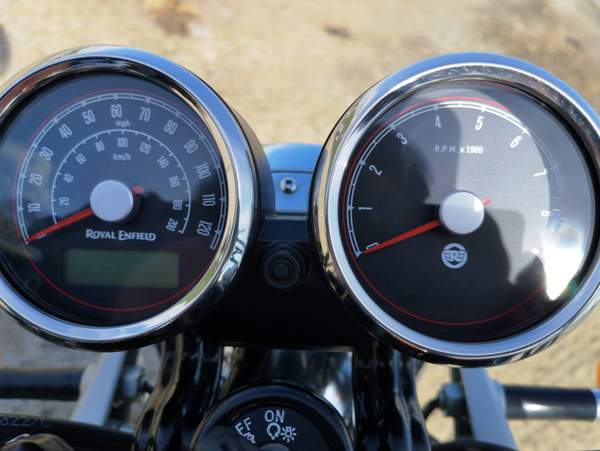 The instrument panel is laid out clearly before you, speedo, fuel gauge and trip in the left clock and rev counter in the right-hand clock, everything very legible, the rear view is supplied by the same round mirrors you'll find on the classic 500, but this time with a lot less vibration. Firing the bike into life the first thing you notice is how creamy smooth and quiet the whole thing is, a little blip of the throttle and you can hear the note of the large twin silencers, not the prettiest but certainly not unattractive. Clutch in and knock it into first, wow!! again you hardly notice it go in. Now, this may be because I'm used to riding a 22-year-old Fireblade or more likely it could be the slipper clutch (whatever that means) every gear change takes the minimum of effort and is smooth and sure. Taking the Interceptor out of the town and into the country was a joy, travelling with the traffic in town the bike proved my first impressions, so light, so nimble so well balanced and behaved, hard to believe I'd only just jumped on it. Leaving the 40mph zone into the 60mph the bike made more than ample progress, hard to believe this thing only has 47 bhp, pulling out to overtake was done with confidence even when I hit a couple of cats eyes and caused the Enfield to have a bit of a wobble, it calmed down quick enough.